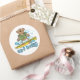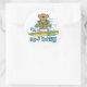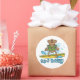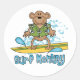 This cute monkey on summer vacation wears a green flowered hawaiian shirt and stands a top his surfboard. Text reads 'Surf Monkey'.