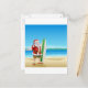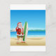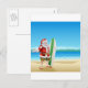 Summer Santa in beach wear, long board shorts or Bermuda shorts and flip-flop sandals, holding a surfboard on a sunny beach.