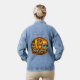 Turn heads with this fun and flirty Island style denim jacket. The retro inspired design captures vintage California surf shack energy with a blonde pin-up surfer clutching her surfboard, waves crashing onto the beach, with an antique van in the background. The ride the wave motto, paired with tropical hibiscus flowers complete the salty coastal sunset graphic.