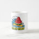 A happy watermelon slice rides the waves on a surfboard, bringing summer fun and fruity vibes