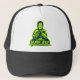Be at one with your board. Design of meditating Buddha atop a surfboard. In dark blue and neon green.