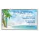 This magnetic business card features a surfboard on a tropical beach with palm trees. The water is a beautiful blue and there are clouds scattered in the sky. -