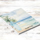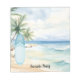 A watercolored sandy beach, ocean waves and palm trees as background, and a blue surfboard on the beach. Personalise and add your name.