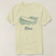 This personalised t-shirt features a stylised simple breezy blue line drawing depicting a surfboard floating on a calm wavy water.