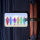 Stand out in the baggage carousel with a Surfboards Beach Luggage Tag which features a beach background with sand, ocean and sky, 6 colourfully decorated surfboards. Text is set up for your name, address and phone number or any text you want. Perfect gift for surfer in your life. Leather luggage strap included.