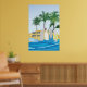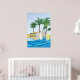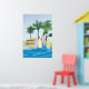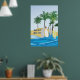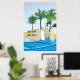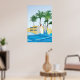 Surfboards on a tropical beach with palm trees poster print, featuring a tropical landscape. There are palm trees and surfboards on the sand and blue waves. It is a template and you can add your text or customise it to change image, text, font, colour. Colour scheme: Blue, green, white, yellow, tan