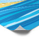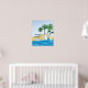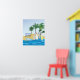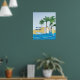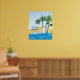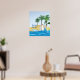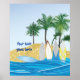 Surfboards on a tropical beach with palm trees poster print, featuring a tropical landscape. There are palm trees and surfboards on the sand and blue waves. It is a template and you can add your text or customise it to change image, text, font, colour. Colour scheme: Blue, green, white, yellow, tan