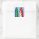 with cool design of two brightly coloured surfboards standing on a beach. These surfboards are retro classic style and reminiscent of a bright Summer, sunny day at the beach. A great design for lovers of the beach and of surfing.