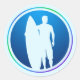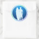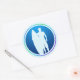 Surfer sticker. Silhouette of surfer holding his board. Circular suffer logo in blue with multi colour outer ring.