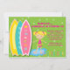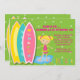 Start your celebration off right with this adorable beach themed invite. It is set on a green background with lighter green polka dots. There are 3 surfboards on the left side of this invitation. One yellow, turquoise, and pink with the words "sun & fun" down it. There's this cute girl with blonde hair standing in a puddle of water. The bottom right hand corner has the word " surfer girl" in pastel lettering. Check out our many other products and designs in this line. ©lillybimble