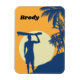 Surfer, palm tree, cliff, Sun, Moon, surfer. Beach scene with Surfer, bright orange, the sun or moon in tan and blue the dominant colours. The name Brody is completely customisable and can be changed to anything you'd like or eliminated together. A nice sized magnet to fill an empty space on a metal file cabinet or perk up your refrigerator.
