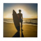 A surfer standing on the beach, with surfboard in hand, in front of the ocean, silhouetted against the rising sun.