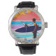 Watch in a surfer standing on the beach, silhouetted against a semi-abstract background of water and a sunset sky