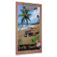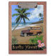 Beautiful retro style design, showing an oldtimer car with surfboard on the beach.