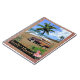 Beautiful retro-style picture, showing an oldtimer car with surfboard on top at the beach, surrounded by tropical vegetation. Text "Surfin' Hawaii" .