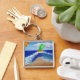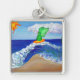 (The painting is of a green angel on an orange surfboard catching a wave. A sun glows in the background and palm tree gently sways on the beach. The wave is getting ready to crash on the beach smoothing the sandy surface. The green angel pays tribute to the Archangel Raphael whose colour is green and is known for bringing healing. The sun helps sustain life and through it plants such as palm trees strengthen and grow. The power of sun's energy is symbolised in the matched orange- yellow surfboard. The beach is clean and smooth. This painting was inspired by the "Wipe Out Cancer Angel". Instead of adding text of this painting, it was left open so you can your own wipe out, riding the wave, or other go with flow message to the beach, cloud, or sky. Proceeds from the sale of this keychain support DonnaBellas Angels, a 501(c)3 non-profit charity.
