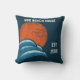 Add a custom touch to your beach house decor or surprise your favorite surfer with a cool personalized gift. This throw pillow or cushion features a retro style illustration of crashing waves in shades of blue with a glowing orange sun above and seagulls silhouetted against the sun. The graphic has a distressed style giving it a worn, vintage look and is set against a navy blue background. Your own customized text appears in distressed style ivory white text.