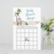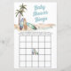 Cute surfing-themed summer baby shower bingo game featuring a watercolor illustration of tropical beach scene with palm trees, sandy shores, and teal, green and brown surfboards, and "Baby Shower Bingo" showcased in a fun retro blue script.