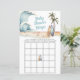 Cute summer surfing-themed baby shower bingo game featuring a watercolor illustration of tropical beach scene with breaking waves, palm trees, sandy shores, and teal and brown surfboards, and "Baby Shower Bingo" showcased in a fun retro blue script.