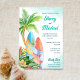Surfing beach tropical seaside wedding invitation template. Palm tree, surf boards, tropical plants, retro font for beach, surfing, tropical themed wedding.