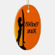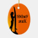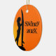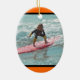 Surfer girl personalized Christmas tree ornament. The image is a girl standing with a surfboard against a bright orange background. Customize black text with her name and year. Add her photo to the back.