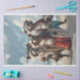 On the golden sands where the ocean kisses the shore, a trio of skunks with surfboards in tow exudes a carefree coolness. They are “The Striped Surfers’ Soiree,” each adorned in vibrant beachwear that mirrors their playful spirits. The first, with sunglasses perched atop his head, is the laid-back leader of the pack. The second, goggles ready, is the daring wave-chaser. The third, in green shorts, is the soulful beachcomber. In the background, a curious fox adds to the eclectic gathering. Above, seagulls glide across the partly cloudy sky, witnesses to the skunks’ seaside escapades. This artwork captures the essence of summer fun, where the scent of saltwater mingles with the spirit of camaraderie and the thrill of the surf.