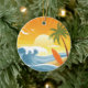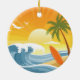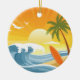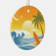 Round design of a beach scene with a small island sporting a palm tree and surf board rising from the sand, surrounded by blue waves under the setting sun.