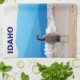 A digital rendering of three Canada Geese contemplate heading out into the incoming surf on the shore of Lake Pend Oreille at Sandpoint, ID; blue mountains are in the distance. Text reading "IDAHO" also appears.