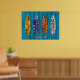 Surf's Up! This fun eclectic art celebrates the love of surfing with surf boards made using vintage license plates from four surf-friendly states, California, Oregon, Florida and Hawaii. Artwork by Design Turnpike.