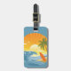 Round design of a beach scene with a small island sporting a palm tree and surf board rising from the sand, surrounded by blue waves under the setting sun. This luggage tag is fully customisable and ready to be personalised.