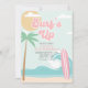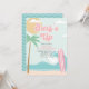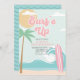 Surfs Up! Surfing Beach Birthday invite with turquoise waves and pink surf board.