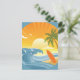 Round design of a beach scene with a small island sporting a palm tree and surf board rising from the sand, surrounded by blue waves under the setting sun. This postcard is fully customisable.