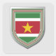 The national flag of Suriname is infused into a gray shield shape. The shield that encapsulates the flag, is surrounded by outlines which are in the flag colors.