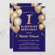 Surprise 1st Birthday Navy Blue and Gold Balloons Invitation