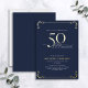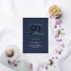This beautiful invitation features hand lettered calligraphy artfully presenting 'fifty' in luxurious hand lettering against a blue background, adorned with delicate swirls in the corners top and bottom in real gold foil, along with the name and the number 50. This image will have all your guests excitedly anticipating your fabulous fiftieth festivities!