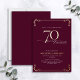 This beautiful invitation features hand lettered calligraphy artfully presenting 'seventy' in luxurious hand lettering against a burgundy background, adorned with delicate swirls in the corners top and bottom in real gold foil, along with the name and the number 70. This image will have all your guests excitedly anticipating your fabulous seventieth festivities!