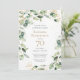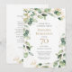 This exquisite, watercolor eucalyptus with gold leaf embellishments and gold splattered dots surprise 70th birthday party invitation with card request is perfect for celebrating your wife, mum, sister, aunt, friend, grandmother. It's soft flowy design is modern yet traditional. Select Personalise this template to make it uniquely your own. In seconds you will see your stunning 70th birthday party invitations.