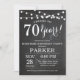 Surprise 70th Birthday Invitation Chalkboard Background with String Lights. Black and White. 13th 15th 16th 18th 20th 21st 30th 40th 50th 60th 70th 80th 90th 100th, Any age. Adult Birthday. Woman or Man Male Birthday Party. For further customisation, please click the "Customise it" button and use our design tool to modify this template.