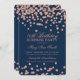 Elegant Surprise 70th Birthday Party invitation design with Rose Gold Glitter Confetti motif on Navy Blue, custom name and date and additional text. Easy to use and easy to personalise.