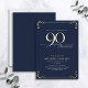 This beautiful invitation features hand lettered calligraphy artfully presenting 'ninety' in luxurious hand lettering against a blue background, adorned with delicate swirls in the corners top and bottom in real gold foil, along with the name and the number 90. This image will have all your guests excitedly anticipating your fabulous ninetieth festivities!