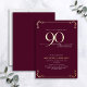 This beautiful invitation features hand lettered calligraphy artfully presenting 'ninety' in luxurious hand lettering against a burgundy background, adorned with delicate swirls in the corners top and bottom in real gold foil, along with the name and the number 90. This image will have all your guests excitedly anticipating your fabulous ninetieth festivities!