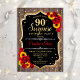 Surprise 90th Birthday Invitation. Feminine rustic black, white, red design with faux glitter gold. Features wood pattern, red roses, sunflowers, script font and confetti. Perfect for an elegant birthday party. Can be personalized to show any age. Message me if you need further customization.
