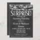 A fun black and white chalkboard surprise anniversary party invitation with glowing lights at the top.