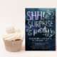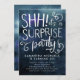 Elegant adult surprise birthday party invitation featuring navy blue watercolor background with white typography text that says "SHH! it's a SURPRISE party" with swirls. Customise this template card by adding your own party information.