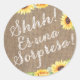Burlap lace effect background with cheerful sunflowers. The stickers have "Shhh! It's a Surprise!" text.