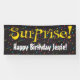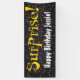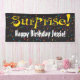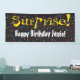 Surprise party banner for birthday or other occasion - edit the Happy Birthday text for your message. Colourful confetti background for party atmosphere with the word Surprise! in large fun font in bright yellow.