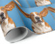 A basset hound with impressively large ears appears against a bright blue background, giving a comical and surprised expression