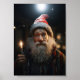 Porait photo from super kind Christmas gnome looking surprised in the lens of the camera holding a candle