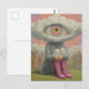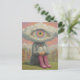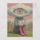 A surreal woman in a grey sweater and pink boots with her head in the clouds and a giant eyeball