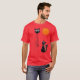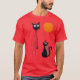 This t-shirt features a stunning, surreal, abstract painting of two whimsical black cats. The larger cat stands tall with wide, expressive eyes, while the smaller one sits gazing up. Set against a textured background of earthy tones with a bright orange sun or moon, the design evokes a dreamlike, painterly atmosphere. The reflective surface beneath the cats adds a unique artistic touch, perfect for those who appreciate abstract art and feline charm.